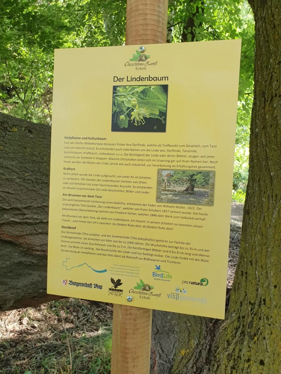 Zur Pflege der Kastanienselve wurden neue Wege erstellt. Diese wurden nun beschildert. Wanderer werden auf den bestehenden Wasserleiten (Visperi, Niwa und Eyholzeri) mit Wegweisern zu einem 30-minütigen Rundweg eingeladen. Die Zunft hat auch neue Bänke zum Verweilen erstellt. Einzelne Bäume wurden beschriftet. Es wurden auch Vogelnistplätze eingerichtet. Für Gross und Klein eine idealer Spaziergang im Wald.