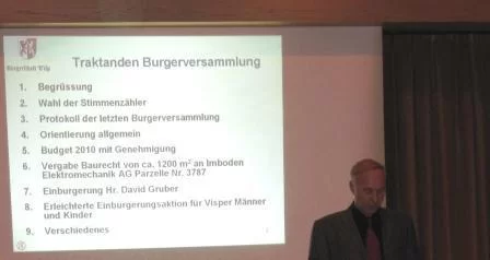 An der Burgerversammlung, die am Montag, 16. November 2009 im Martinsheim Visp abgehalten wurde, haben die ca. 70 Burgerinnen und Burger über die folgenden wichtigen Entscheide befunden: