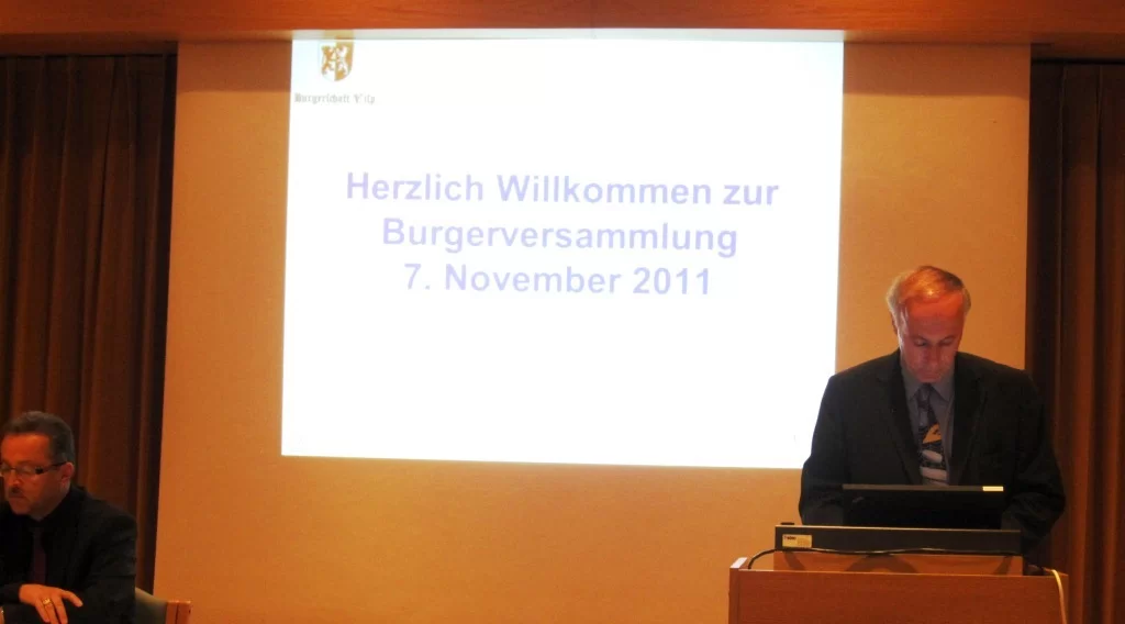 Die Burgerversammlung vom 7. November 2011 im Martinsheim Visp wurde von ca. 70 Burgerinnen und Burger besucht. Die Burgerinnen und Burger haben über folgende wichtige Entscheide befunden. Der Voranschlag 2012 wurdegt einstimmig genehmi.