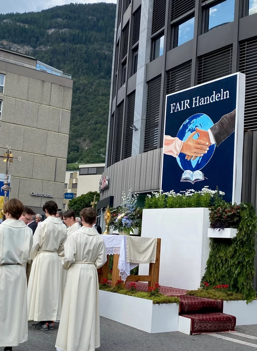 Am Donnerstag, 8.6.2023, wurde im Wallis das Fronleichnams-Fest gefeiert. Am Vorabend, Mittwoch, ist der sogenannte "Zapfenstreich". Die Musikgesellschaft und die Tambouren- und Pfeifer spielen in Visp und Eyholz auf. Am Donnerstag, früh um 04:00 Uhr, wird die "Tagwacht" gespielt und die Leute so daran erinnert, an die Prozession zu kommen. Um 9:00 Uhr beginnt die Prozession. Diese führt zu den Altaren von Eyholz und Baltschieder. Beim letzten Altar, der Visper Altar, vor dem Burgerhaus Visp wird der Gottesdienst abgehalten. Die Teilnehmer werden dann von den Musiken auf den Martiniplatz begleitet. Dort folgt der Fahnenmarsch und die Burgerfahne verabschiedet sich ins Rathaus.