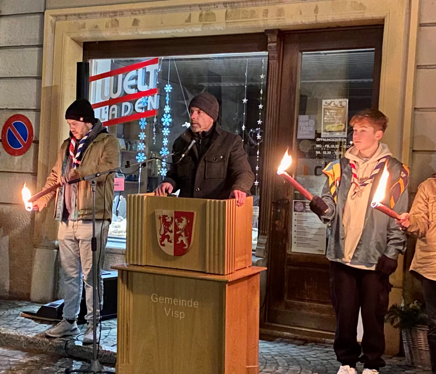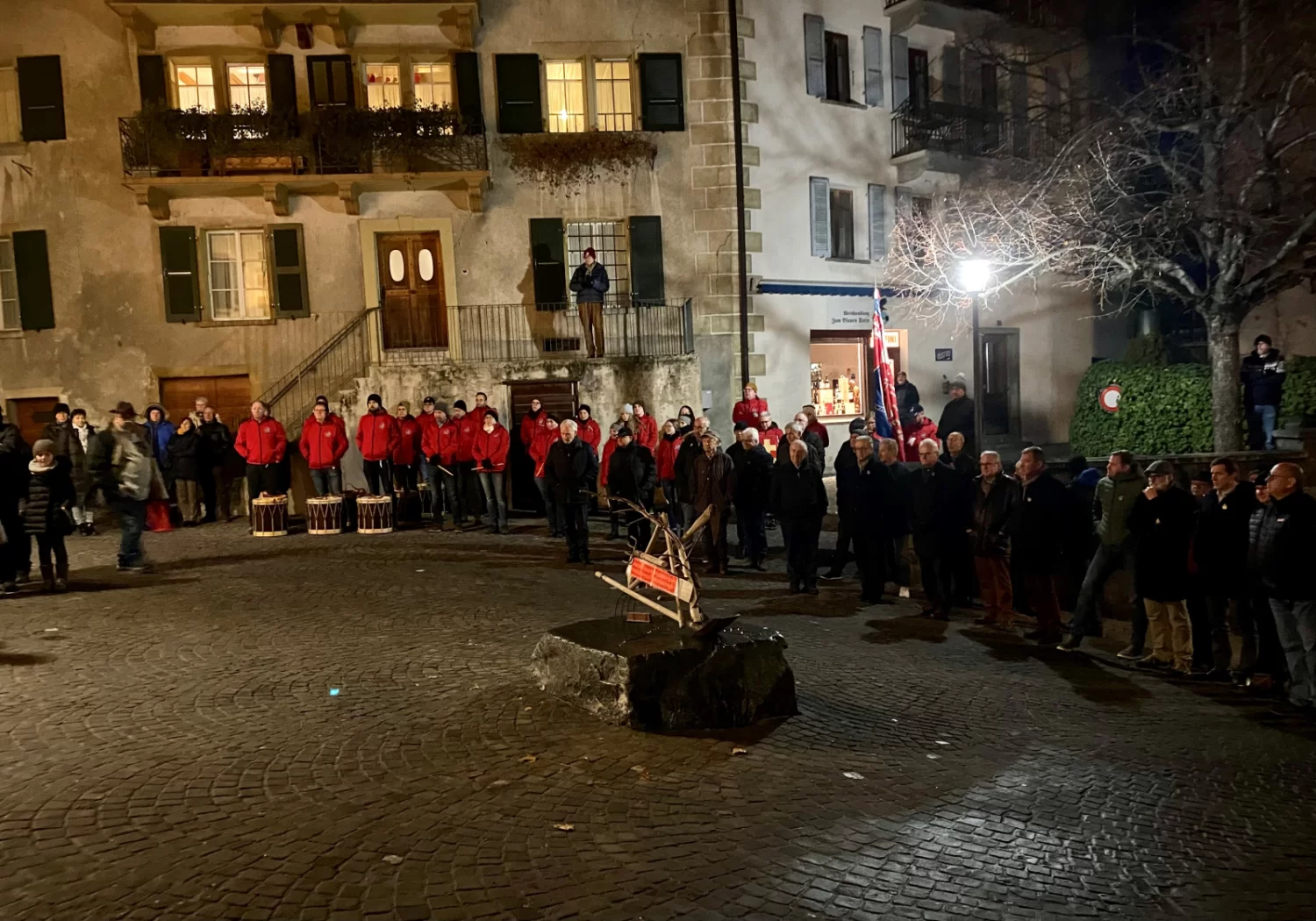 Beim „Blauen Stein“ wurde das Manifest abgehalten. Burgerrat Tobias Wirthner war für die Organisation verantwortlich und begrüsste die Teilnehmer. Als Redner konnte dieses Jahr Staatsrat Franz Ruppen gewonnen werden. Nach seiner eindrücklichen Rede über den Weltfrieden begaben sich die Teilnehmer ins Kultur- und Kongresszentrum La Poste, wo Speis und Trank für alle serviert wurde.