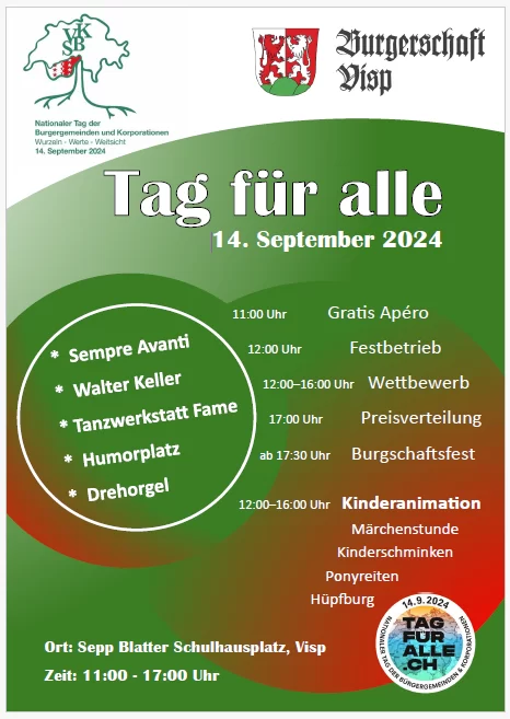 Am zweiten Samstag im September findet alljährlich die Waldbegehung der Burgerschaft Visp statt. Da nun am 14. September 2024 der Nationale Tag der Burgergemeinden und Korporationen durchgeführt wird, organisiert auch die Burgerschaft Visp diesen Tag nicht im gewohnten Rahmen. In Zusammenarbeit mit dem gleichzeitig stattfindenden Burgschaftsfest in Visp feiert die Burgerschaft Visp den «Tag für alle» auf dem Schulhausplatz des Sepp-Blatter-Schulhauses. Es werden diverse Darbietungen und Spiele für Gross und Klein angeboten. Ab 11:00 Uhr ladet die Burgerschaft Visp zu einem Apéro ein. Die Kantine ist ab 12:00 Uhr für alle offen. Dort kann sich jeder zu günstigen Preisen verköstigen. Die Burgerinnen und Burger erhalten eine separate Einladung mit Anmeldetalon.