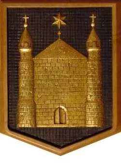 In Schwarz ein zweitürmiger goldener Dom mit offenem Portal, überhöht von einem fünfstrahligen goldenen Stern. Sie finden das Wappen in der Burgerstube von Visp.