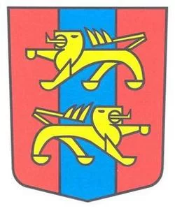 In Rot ein blauer Pfahl, überdeckt von zwei schreitenden goldenen Löwen, der untere nach links gewendet.