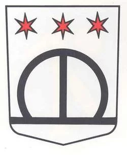 In Silber eine schwarze Gürtelschnalle, überhöht von 3 sechsstrahligen roten Sternen nebeneinander.